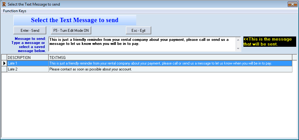 Individual texts may be sent from the Payment screen and the On Screen Account Manager. Press F7 to send a text. You have the option of writing a one-time message or you may create a list of saved messages to choose from. Press Enter to send.